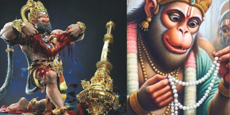 The story begins when Lord Rama returned to Ayodhya after his victorious conquest of Lanka and was crowned the king. Vibhishana, Ravana’s brother, came to the court and presented Rama a priceless pearl necklace as a gift. Rama suggested that Vibhishana offer the necklace to Devi Sita. Sita, who, in turn gifted it to Hanuman as a token of his devotion for Rama. However, Hanuman astonished everyone by breaking the necklace apart. He meticulously examined each pearl and discarded them one by one. Sita, confused and offended along with others in the court, questioned his seemingly disrespectful behavior. Hanuman humbly replied that he was searching for Lord Rama and Devi Sita within the pearls, as anything devoid of them was useless to him, no matter how precious. To further emphasize he proclaimed that every inch of his being contained Rama. Doubtful of his claim, the court challenged him to prove it. In a moment of profound reverence, Hanuman tore open his chest, revealing Lord Rama and Devi Sita glowing within his heart. The powerful depiction in Bhakti Shiromani, by Tulsidas is a testament to Hanuman’s innocence and unshakeable devotion.